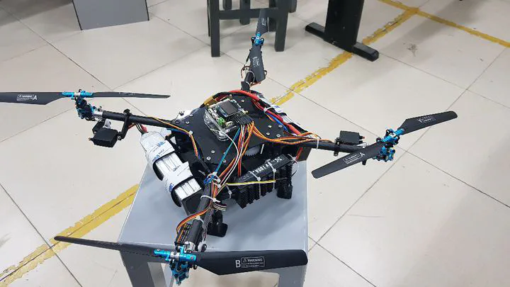 Using a single motor to drive the propellers through gears and a synchronous belt. Utilizing a helicopter tail rotor pitch control mechanism to regulate lift.